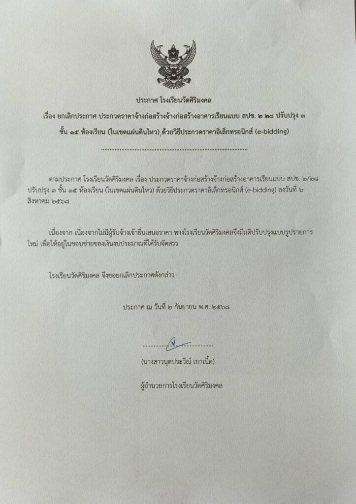 ประกาศโรงเรียนวัดศิริมงคล เรื่อง ยกเลิกประกาศประกวดราคาจ้างก่อสร้างอาคารเรียนแบบ สปช.๒ ๒๘ ปรับปรุง ๓ ชั้น ๑๕ ห้องเรียน(ในเขตแผ่นดินไหว) ด้วยวิธีประกวดราคาอิเล็กทรอนิกส์ (e-bidding)