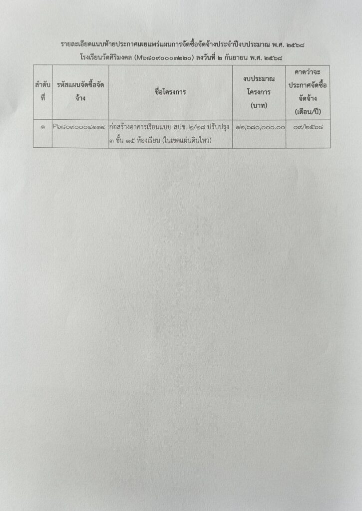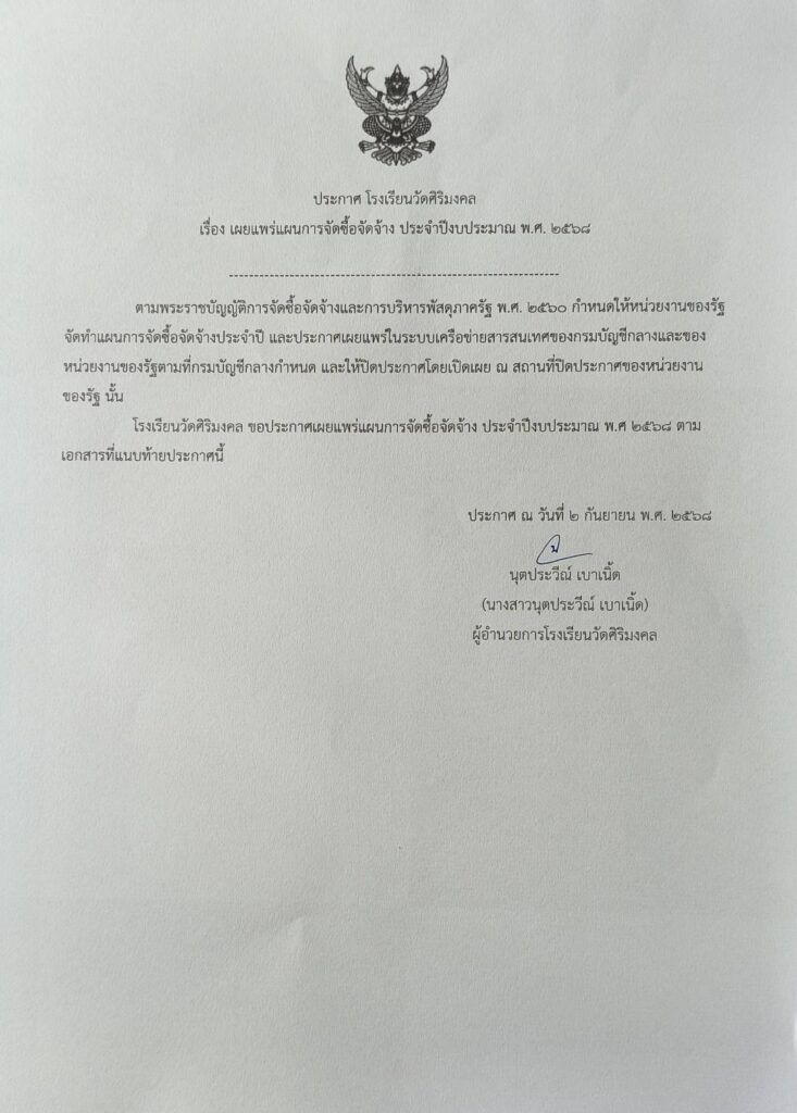 ประกาศโรงเรียนวัดศิริมงคล เรื่อง เผยแพร่การจัดซื้อจัดจ้าง ประจำปีงบประมาณ พ.ศ.๒๕๖๘