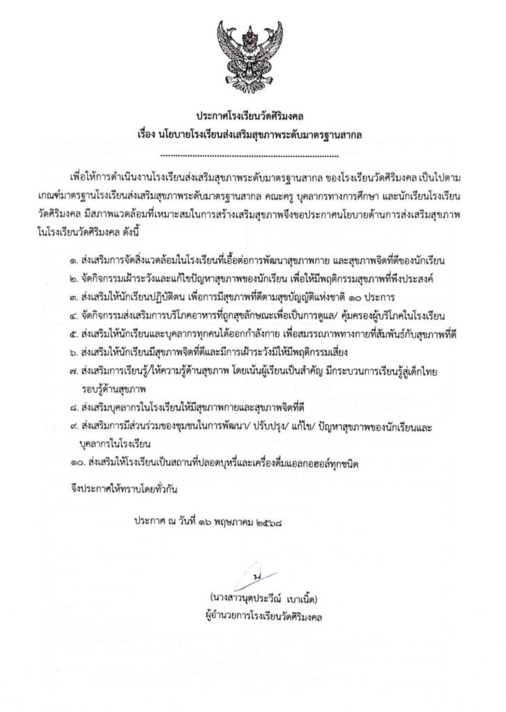 ประกาศจากโรงเรียนวัดศิริมงคล เรื่องนโยบายโรงเรียนส่งเสริมสุขภาพมาตรฐานสากล