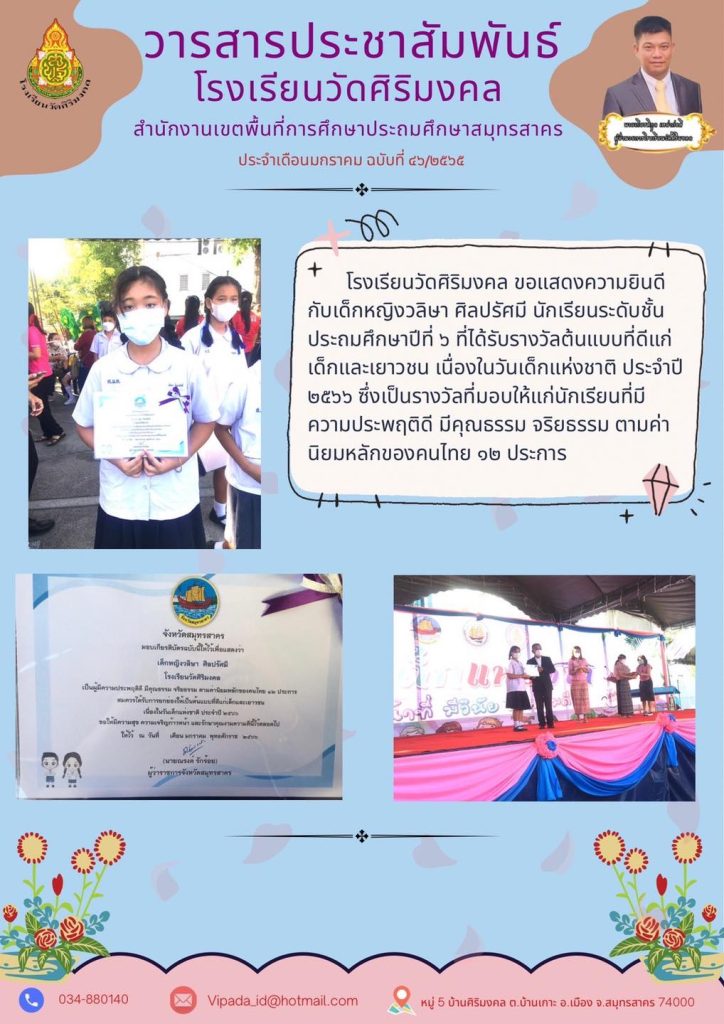โรงเรียนวัดศิริมงคล ขอแสดงความยินดีกับ เด็กหญิงวลิษา ศิลปรัศมี นักเรียนระดับชั้นประถมศึกษาปีที่ 6 ที่ได้รับรางวัลต้นแบบที่ดีแก่เด็กและเยาวชน เนื่องในวันเด็กแห่งชาติ ประจำปี 2566 ซึ่งเป็นรางวัลที่มอบให้แก่นักเรียนที่มีความประพฤติดี มีคุณธรรม จริยธรรม ตามค่านิยมหลักของคนไทย 12 ประการ