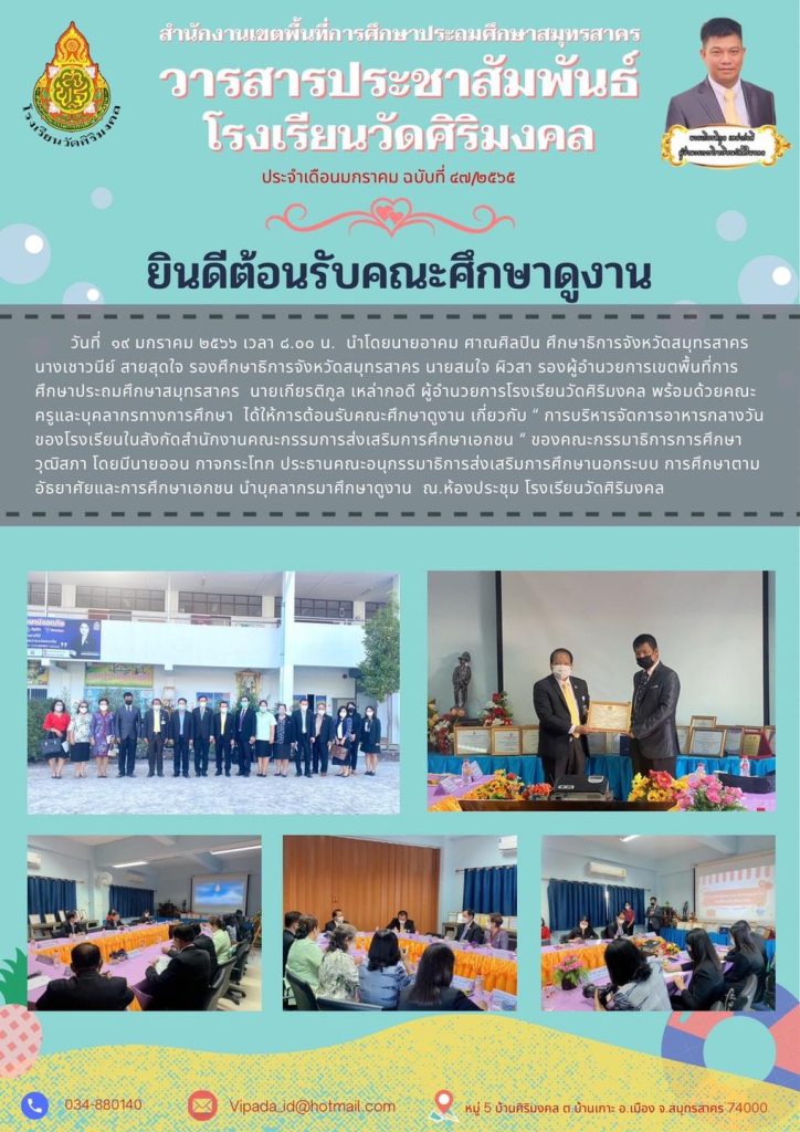 โรงเรียนวัดศิริมงคล ต้อนรับคณะดูงานคณะกรรมาธิการการศึกษาวุฒิสภา โดยมีนายออน กาจกระโทก ประธานคณะอนุกรรมาธิการส่งเสริมการศึกษานอกระบบ การศึกษาตามอัธยาศัยและการศึกษาเอกชน ได้นำคณะมาศึกษาดูงาน ณ ห้องประชุมโรงเรียนวัดศิริมงคล หัวข้อเกี่ยวกับ “การบริหารจัดการอาหารกลางวันของโรงเรียนในสังกัดสำนักงานคณะกรรมการศึกษาเอกชน